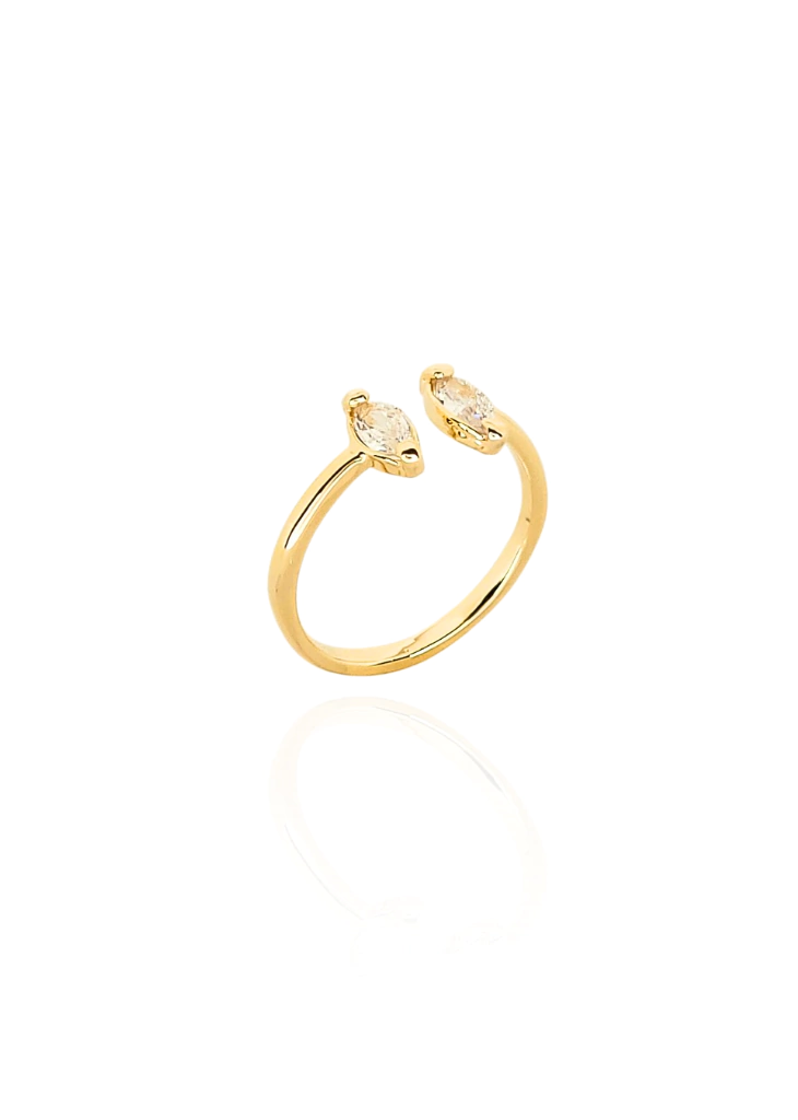 Anel ajustável, aberto na parte superior, com duas zircônias crystal em lapidação navete trazendo um acabamento super moderno e brilhante!